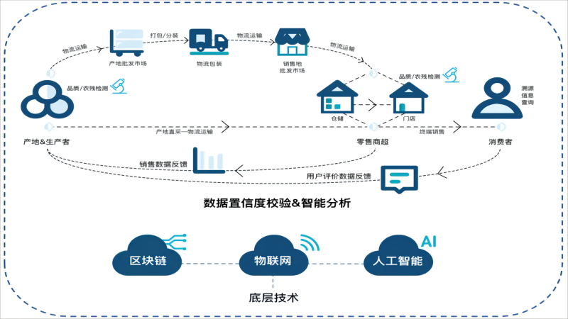 打通现实世界和数字世界的商流、物流、信息流和资金流四流合一,对农产品的产地环境、农业投入品、农事生产过程、质量检测、加工储运等质量安全关键环节进行数字化管理,为农产品建立“身份证”制度,实现农产品的全程可追溯。